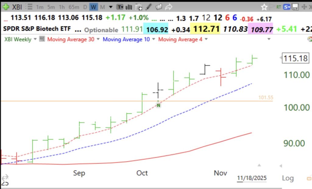 Also, check out this weekly chart of XBI, a biotech ETF. It is in a steady up-trend, tracking the 4 wk avg (orange dotted line). It is not at an ATH. There may be a rotation out of tech stocks and into biotechs.