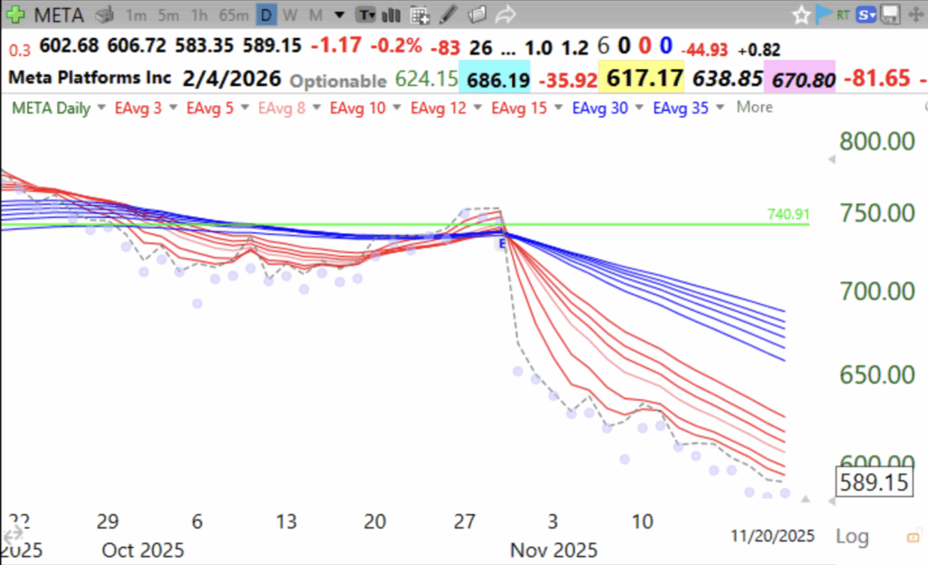 NVDA’s short term averages (red) have now converged with their longer term averages (blue). Below is the daily modified Guppy chart for NVDA. The dotted line shows the daily closes.If the red lines decline below all of the red lines, it will be a BWR down-trend (see chart of META below) and very ominous. Regarding the weakening ETF, QQQ, I am accumulating the 3x leveraged inverse ETF, SQQQ, which rises 3x more than QQQ declines. I am mainly in SQQQ in my trading accounts. The longer term trends remain up so I have not yet exited the mutual funds in my retirement accounts. But market indexes, and especially their equal weighted equivalents (QQQE, RSP), look much weaker. This means that the smaller companies, which are masked by the large cap tech stocks in the weighted indexes, are much weaker.