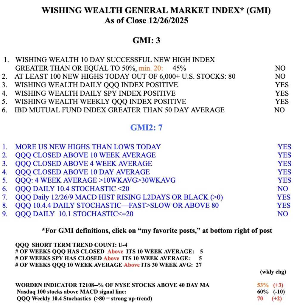 The GMI is 3 (of 6), reflecting the fact that fewer stocks are hitting new highs. But it is still GREEN.