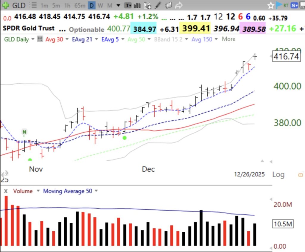 Many years ago I learned when a stock I owned went vertical and my internal voice said, “this is too easy,” it often meant the stock was having a final climax run. SLV appears that way to me. On Friday it zoomed on the highest trading volume in a long time. This daily chart shows that SLV has closed above its rising 5 EMA (blue dotted line) for 20 consecutive days after its GLB!!!! Social media is filled with posts about silver and gold. Is this too easy? We need to be careful.