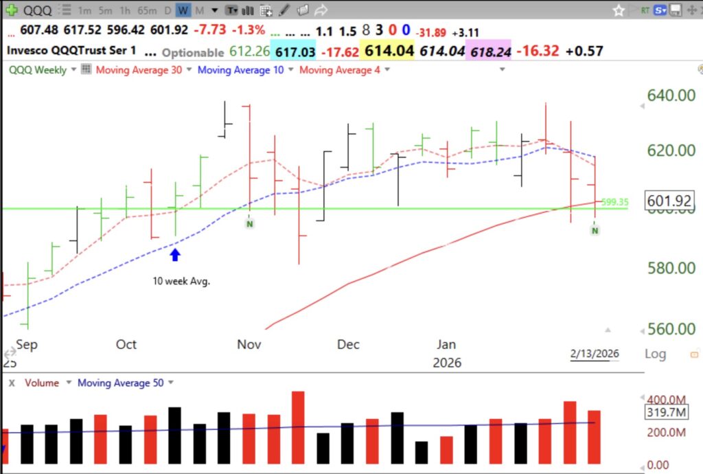 QQQ is sitting on its last Green Line top from last October and its 30 week average (red line). In other words, QQQ is back to where it was last October! If the 30 week average turns down in a Stage 4 decline, I will exit the markets. That was the signal to help me avoid all prior drops since 2000. Note that the 4 wk average (red dotted) is now below the 10 week average, another sign of weakening. I am largely in cash in my trading accounts with very close stops.
