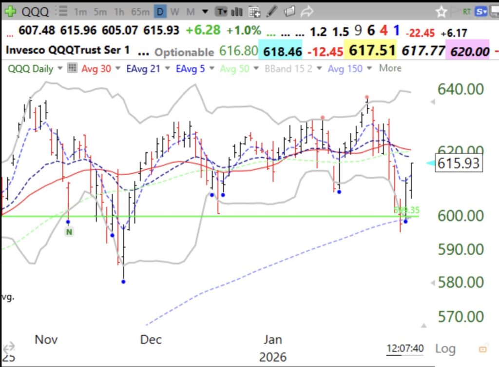 It is possible that the prior winners have gone to extremes and that other stocks are having their day before the entire market drops?  Best for me to own little, have close stops and wait for Mr. Market to reveal his intentions. The gold and silver and mineral stocks are bouncing from oversold. Will they retake their ATHs? Note the Blue Dot of Happiness, oversold bounce, on Friday on QQQ. Resistance is at the 2.15 upper Bollinger Band.
