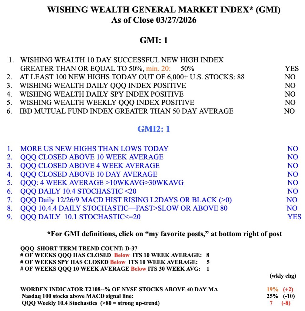 GMI=1 and remains RED. T2108=19, still above the level where many bottoms have occurred, below 10.