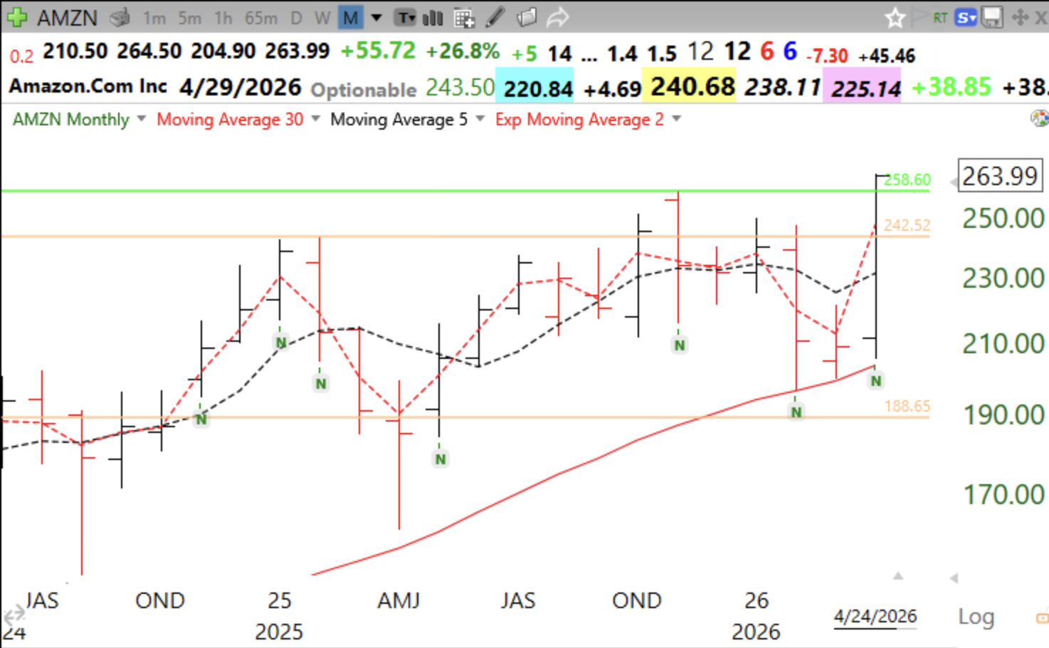 AMZN had an above average volume GLB on Friday. It reports earnings this week. See daily and monthly charts. AMZN must not close below green line @258.60. To see my presentation to the MoneyShow last week where I describe the GLB setup and how I trade it, please go to the Webinars tab on this blog above. You can also sign up in the video to get on the waiting list for my Masterclass with Richard Moglen. Also, tab above for the discount coupon for TC2000, which I use to identify my setups.