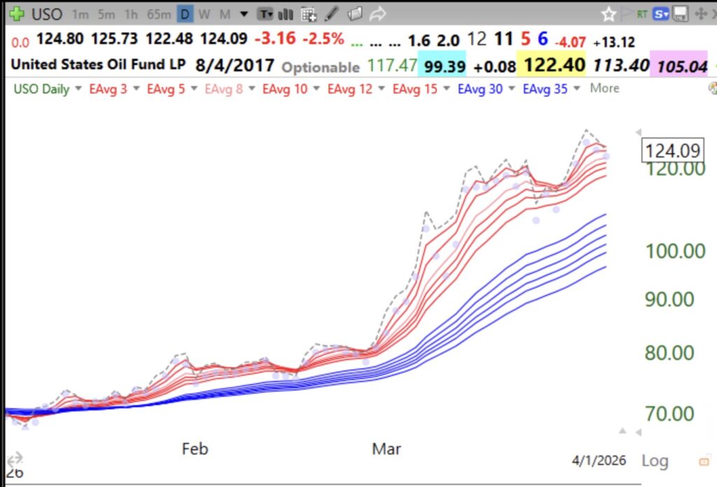 Just look at a modified daily Guppy chart before buying or selling. A picture is worth a thousand words, or dollars. Ignore the fundamentals and stories. Just look at the stock’s behavior. I am sorry for those who are holding RH. In an up-trend all of the red lines must be rising well above the blue lines=RWB, see chart of USO. The dotted line shows the daily closes.