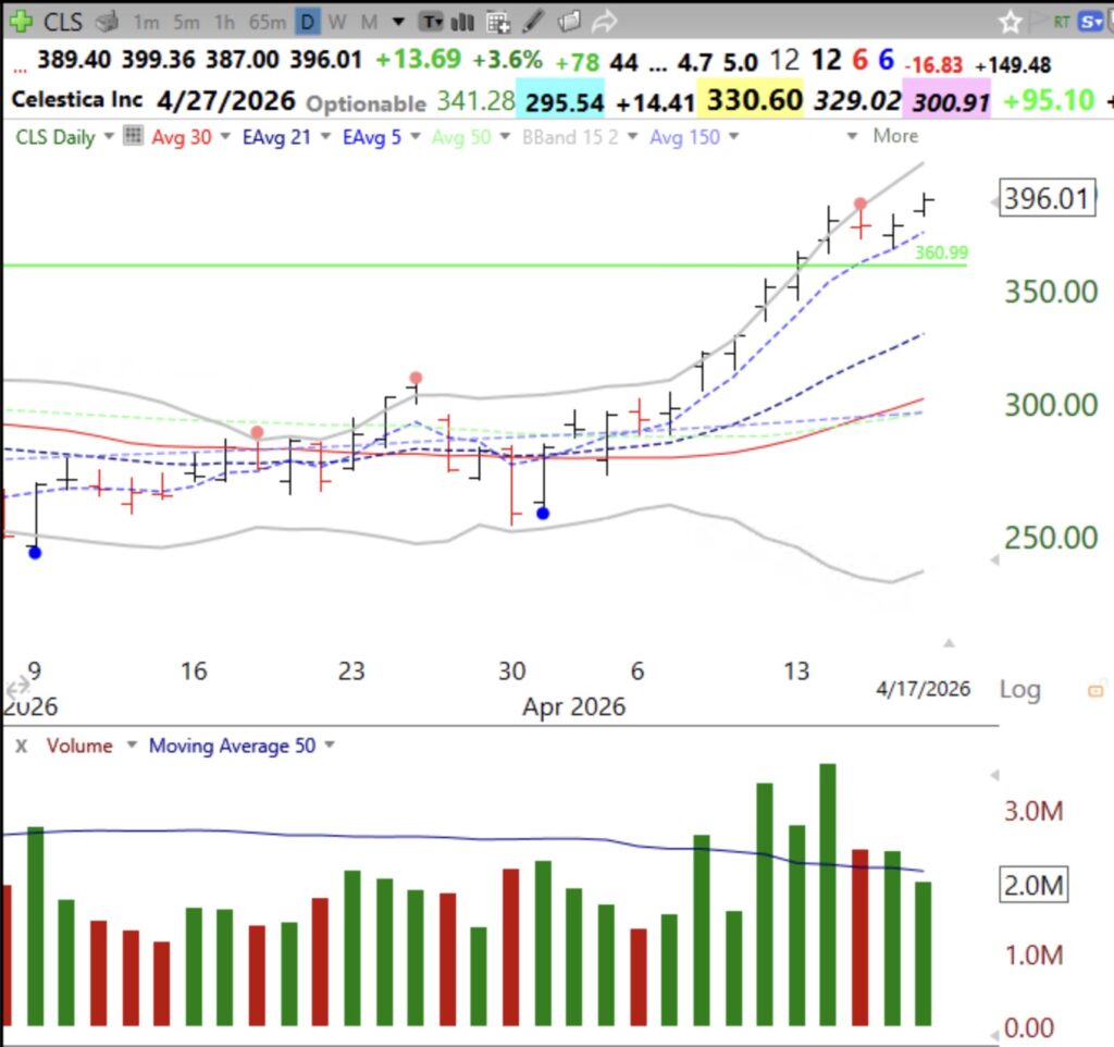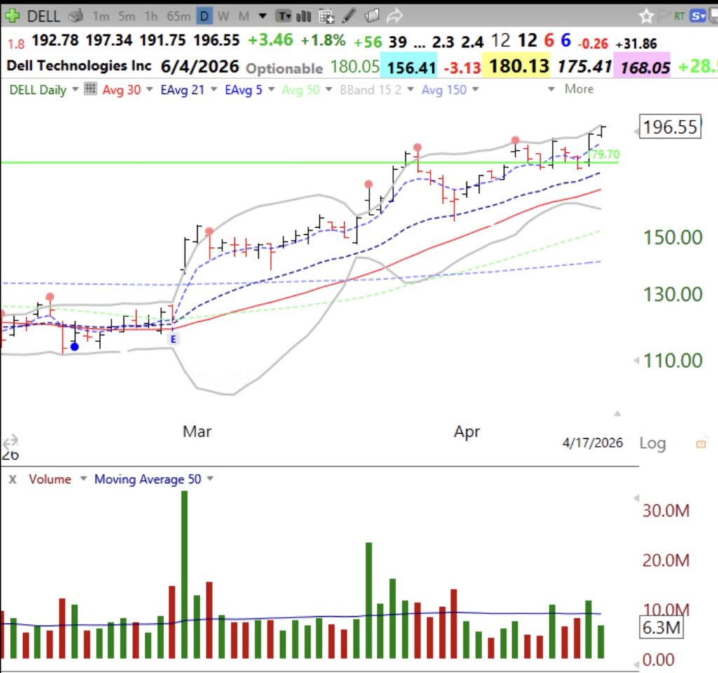 I found that 32 of the 152 stocks were banks, followed by 20 that were in the semiconductor sector. I found that AMD had a GLB last week. See its weekly chart. A close below the green line @267.08 would constitute a failed GLB and require me to exit if I had a position. Other stocks with a high volume GLB last week include: DELL, MRVL, CLS, see their charts below.