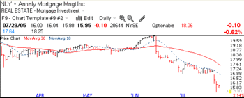 The stock is declining and the 10 day average (dotted line) has now crossed below the 30 day average (red line). By the way, check out Jim Cramer’s "Best of Breed" in this sector, NLY. Sure hope you did not follow his recommendation on this mutt!