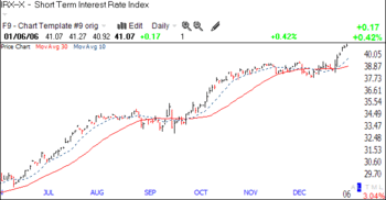 The short term interest rate indicator that we have posted a few times has again broken out to the up side. Why is the smart money betting on still higher rates? This market could reverse down quickly if the hopes for a slowing Fed fail to materialize……..