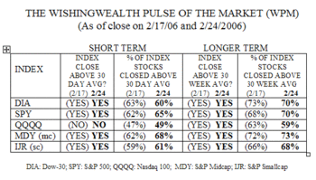 Only the QQQQ closed below its 30 day average and only 49% of its component stocks closed above their 30 day averages. In contrast, 60-68% of the components of the other four indexes closed above their 30 day averages. All five indexes closed above their longer term 30 week averages and almost 70% of the components of all indexes but the Nasdaq 100 (59%) closed above their 30 week averages. The midcap stocks appear to be most likely to be in short and long term up trends……..
