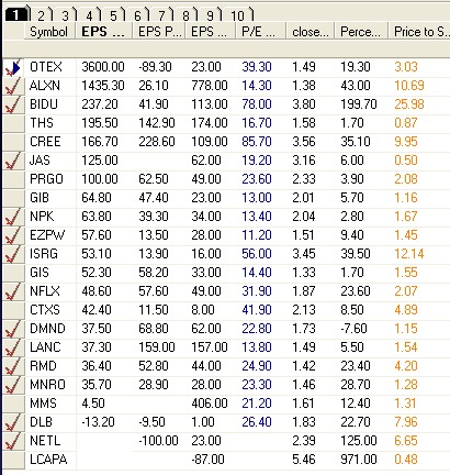 Taking a look at the surviving 22 stocks in this table (click on table to enlarge) I can make some additional observations about these stocks. For all of the stocks with earnings increases of at least +35.7% (column 2) but one (ISRG), their PE (column 5) is less than their earnings % increase for the most recent quarter. This means that their PEG (PE to growth ratio) was less than 1, suggesting that the stock may be in a favorable price range to people who use this statistic as an indication of a stock’s value. For example, CREE had a recent quarterly earnings increase of +166% and a PE of 86, giving a PEG of .52 (86/166). The PE is high, but the earnings growth is even higher. Even ISRG has a PEG close to 1 (56/53). (The table is sorted by column 2, most recent quarter’s earnings change.) Note also that P/S (column 8, the price to sales ratio, analogous to the PE, but using sales instead of earnings) for half of these stocks is less than 2, another indicator of value, to some. Some technicians believe that sales are a better measure of a company’s performance than earnings, which can be more erratic. Where there is no value in the table, it means that there were no earnings with which to make a comparison. Note that there are a few companies that have relatively high earnings and revenue increases (ALXN, BIDU, CREE, ISRG, NFLX). These stocks might be especially good candidates for additional analysis. (Column 7 shows % change in revenue in the most recent quarter. ) Other characteristics that I would look at next is trends in the volume of shares traded, recent news, next earnings dates, and the types of fundamental and technical information provided in the IBD Stock Checkup screen.