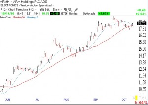 Friday is option expiration day. Tech stocks should rise early, in reaction to GOOG’s good earnings. The GMI and GMI-R remain at their maximum levels. Below is a daily chart of ARMH, which just bounced from its 30 day average after having an oversold stochastic reading. ARMH has been a strong RWB stock. If I bought ARMH, I would place a stop below the 30 day average just below the recent low, at 17.69. Click on chart to enlarge.