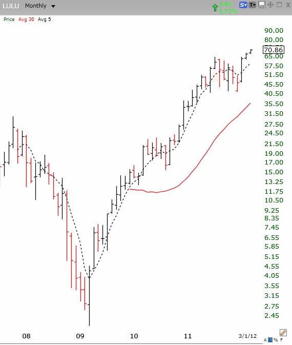 LULU has recently broken to a new all-time high. Check out this monthly chart. Click on chart to enlarge.