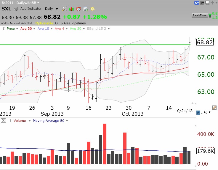 ARMH came up in my TC2000 alert as a green line break-out early Monday. I bought some. ARMH makes components in Apple hardware and its rise may be related to Apple’s product announcements scheduled for Tuesday. ARMH also reports earnings before the open on Tuesday. Note Monday’s above average volume.