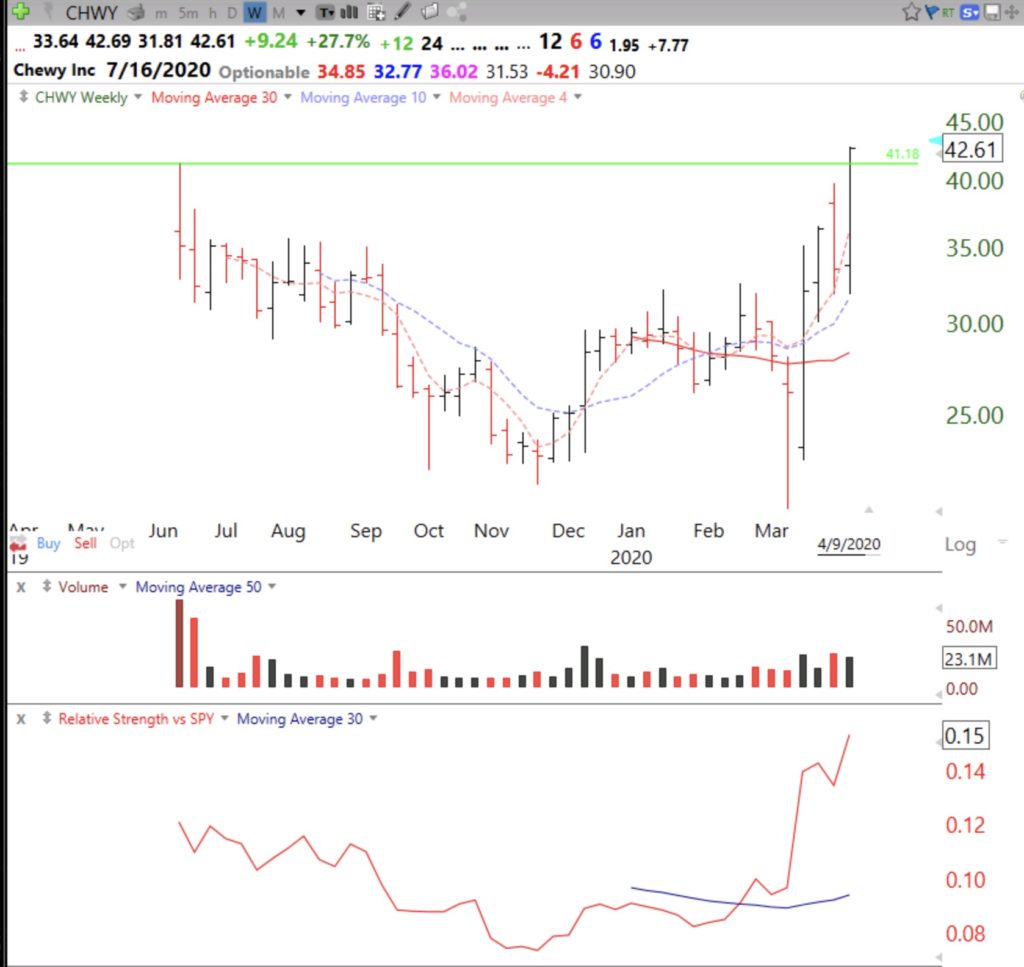 “Also, I love CHWY, based on my own wonderful experience ordering food and toys for my newly inherited dog. CHWY has been said to be the Amazon of pet supplies. And owners pamper their pets in hard times. I set an alert in TC2000 to tell me when CHWY makes a GLB, at $41.18, but may buy a smidge now (just before earnings) in case it pops with earnings.