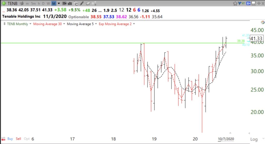 Monthly chart shows TENB is a recent IPO (2018). It is a turnaround, estimated to be profitable in 2020 with an IBD composite rating=95.