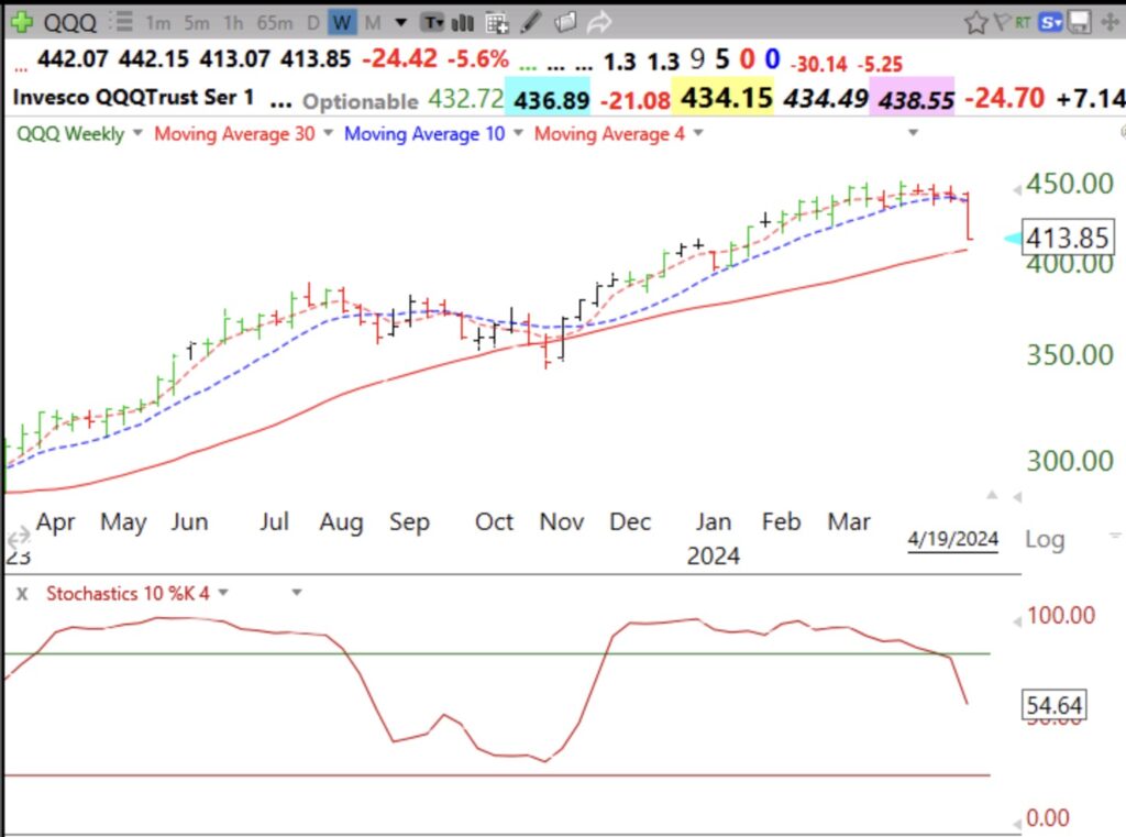 I recently discovered that the weekly 10.4 stochastic is a great indicator for an advancing market or stock. I am now recording the value in the last line of my GMI table, see below. Look at this weekly chart of QQQ. Note that the strong advancing market typically has a weekly 10.4 stochastic >=80 for many weeks in a row. This stochastic basically shows whether a stock is currently near the top of its range over the past 10 weeks. A daily stochastic with a value >80 is typically considered to be a sign of being overbought. But for a weekly time period it tells me that the stock or index is currently close to the top of tis 10 week price range. Isn’t that what we want to see in advancing market indexes or individual stocks? QQQ’s current 10.4 weekly stochastic is now=55, indicating to me the end of the recent multi-week advance. Most of my scans for strong stocks now require that the stock have a weekl y10.4 stochastic>80 for 5 or more weeks in a row. That is a strong rising stock. Here are two examples. Try it out.