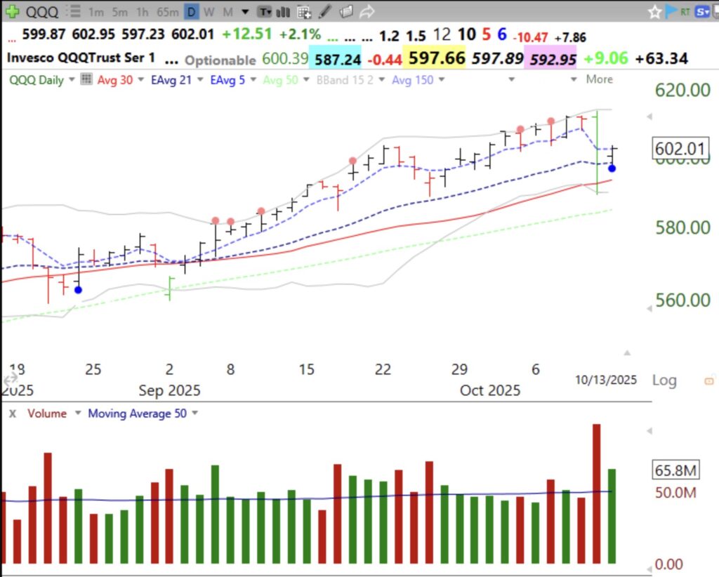 Blog Post: Day 35 of $QQQ short term up-trend; $QQQ has a blue dot (oversold bounce), GMI back to 5 (of 6). Monday, October 13, 2025 @ 10:22 pm by Dr. Wish GMI5/6 GMI-24/9 T210830% QQQ had a blue dot bounce, see daily chart. Buying a little $TQQQ to hold for as long as the short term up-trend continues. Screenshot Share this: Click to email a link to a friend (Opens in new window) Email Click to share on Facebook (Opens in new window) Facebook Click to share on X (Opens in new window) X Click to share on LinkedIn (Opens in new window) LinkedIn Click to print (Opens in new window) Print More Click to share on Pocket (Opens in new window) Pocket Click to share on Pinterest (Opens in new window) Pinterest Click to share on Tumblr (Opens in new window) Tumblr Click to share on Reddit (Opens in new window) Reddit Click to share on Telegram (Opens in new window) Telegram Click to share on WhatsApp (Opens in new window) WhatsApp Related