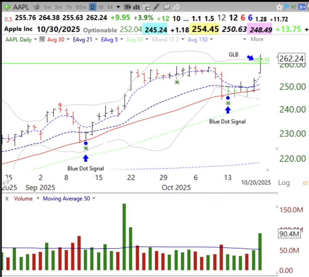AAPL followed through after its Blue Dot of Happiness signal and had a GLB to an ATH. For a definition of the Blue Dot of Happiness signal, see my recent presentation to the TraderLion Conference, Day 6.