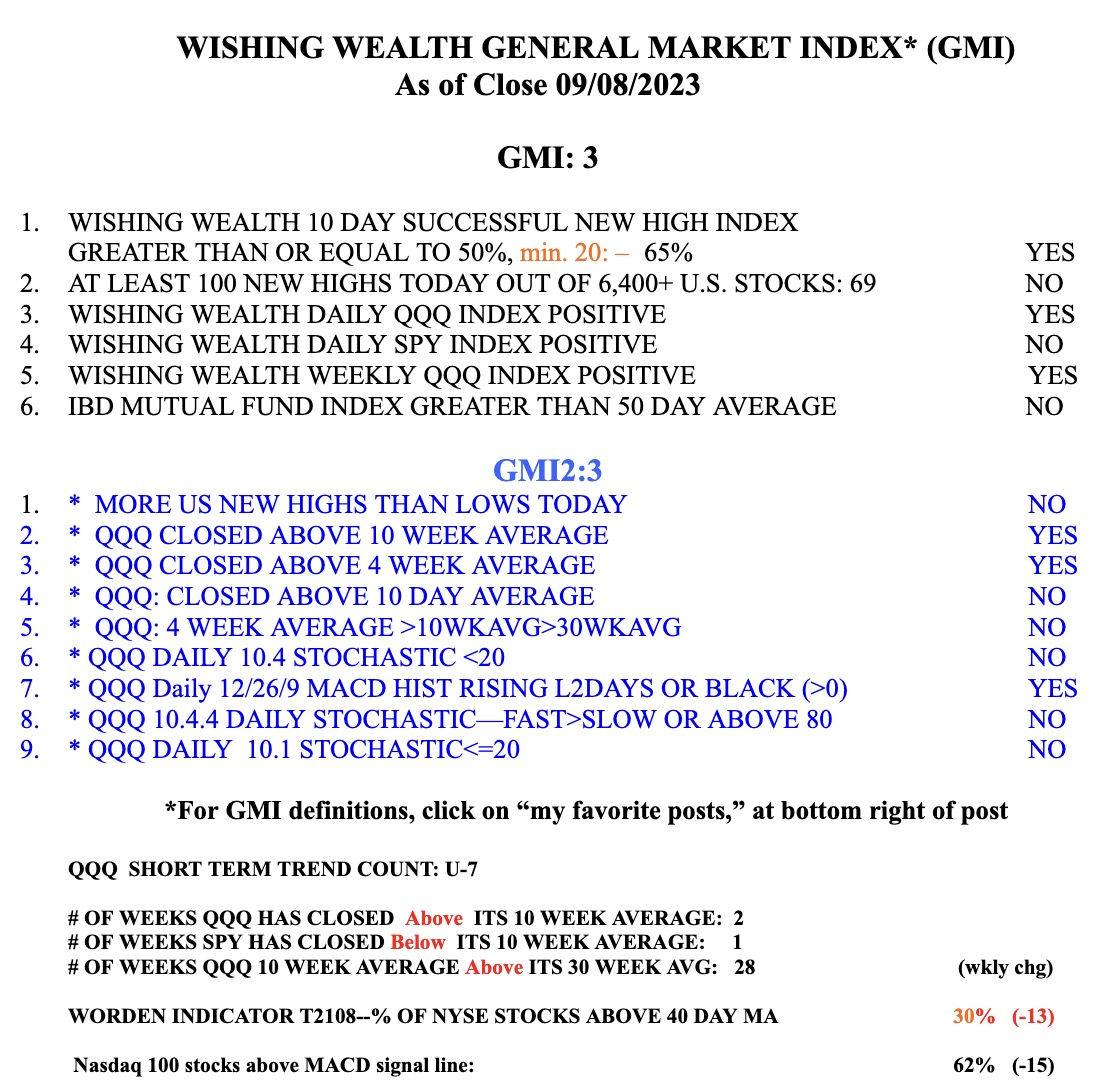 The GMI, which measures the longer term trend, is still Green, registering 5, of 6. Note in GMI2 section that the daily 10.1 stochastic is <20, indicating short term oversold. Declines are more likely to end, however, when QQQ’s daily 10.4 stochastic, currently 39, is <20.