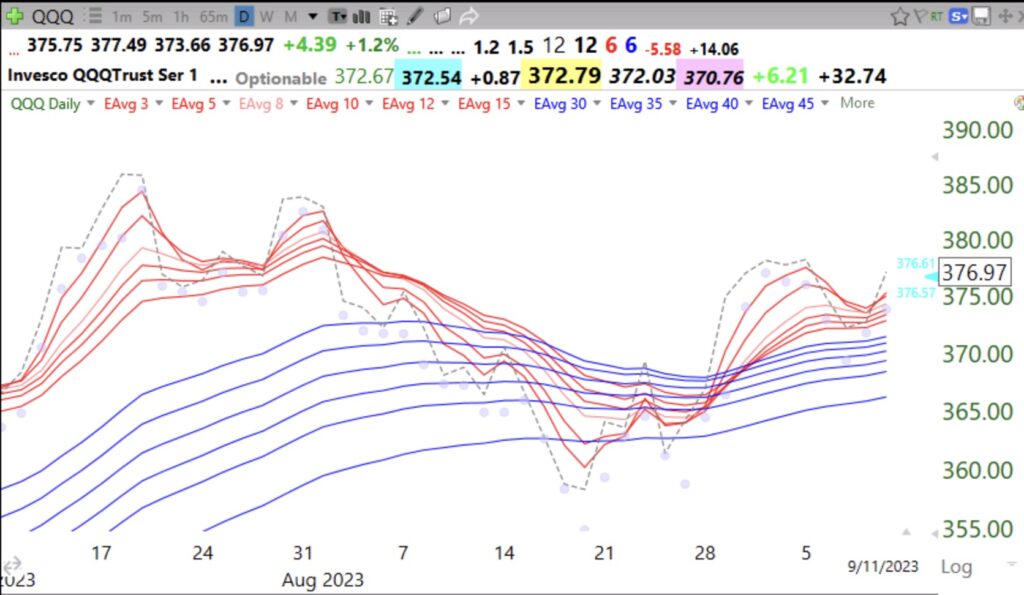 I have observed that during the post-earnings release period, like now, the market often declines, setting up for the advance when the next quarter’s earnings are released. If the QQQ short term trend turns down on Monday, I will wait on the sidelines until it bounces. QQQ is not really down enough to be oversold but it could still turn up here. It is also right on the lower 15.2 daily Bollinger band, an area of support. Better for me to wait to see if QQQ holds. If it does not, the next line of support is the 50 day average, shown by the green dotted line. Next is the green line. Of concern to me are the red spikes in trading volume on recent down days. Also, QQQ has closed up on only 3 of the last 10 trading days. Beware!