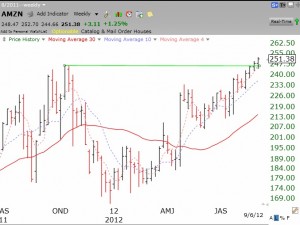 We all tend to steer our cars (lives) with our hands on the rear view mirror rather than by holding the steering wheel and looking ahead. We look back to the horrific markets of 2002 and 2008 and the lack of progress over the past decade and are afraid that the current market rise is phony and doomed to fail. I read that William O’Neil, founder of IBD, has recently said that the market may be on the verge of a huge multi-year advance like the one that he accurately predicted in the early 1980’s. Jim Cramer also opined last week, after consulting a technical analyst and his charts (something that he claimed only “morons” did before many of his fundamentally based picks were decimated during the 2008 decline), that the market may be embarking on a multi-year bull market. So I used TC2000 to build this yearly chart of the S&P500 Index to take a look for myself.