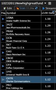 The current up-trend is now in its 72nd day and is the fourth longest up-trend since 2006, the way I define them. Another down or flat day in the QQQ will begin a new short term down-trend. If that happens, the GMI might also approach a Sell signal. (IBD now sees the “Uptrend under pressure.”) I also wrote last week, however, that the end of a short term up-trend has not necessarily implied the beginning of an extended short term down-trend. The new down-trend could become only a short pause in this long term up-trend. The fact that the Worden T2108 indicator , the put/call ratio and my other favorite technical indicators are not at extremely oversold levels leads me to conclude that we have more of a decline to come. But no one, including me, knows for sure what will happen. I am therefore 90%+ in cash in my margin and trading accounts. I remain fully invested in mutual funds in my university pension accounts, which limit my ability to go in and out. As long as the market remains in a Weinstein Stage 2 up-trend, I will stay invested there.