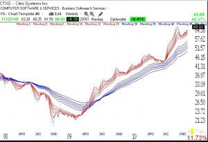 CTXS is also a RWB rocket stock, as shown by the weekly GMMA chart below. All of the short term averages (red) are well above the rising longer term averages (blue).