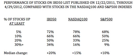 Over the years I have investigated how well the IBD100, now IBD50, stocks perform versus other groups of stocks.   The stocks that meet the IBD growth criteria usually outperform other stocks in a rising market, but under-perform in a falling market. I replicated my past analyses by looking at the performance of the IBD 50 stocks published on 12/22/2011 at the beginning of this year’s rise, through last Friday.   The IBD50 stocks did much better than the NASDAQ 100 stocks or the S&P500 stocks.   The median change in the IBD50 stocks was +20%, compared with +15% for the NASDAQ 100 stocks and +10% for the S&P 500 stocks.   Moreover, the IBD 50 stocks really shined when looking at the likelihood of a larger ,+30% gain.   34% of the IBD 50 stocks gained 30% or more, compared with only 16% of the NASDAQ 100 stocks and 9% of the S&P500 stocks.   Clearly, the IBD selection criteria resulted in a lot more winners than one would find among the stocks in these other two indexes. That is why I focus largely on watch lists and scans containing stocks that have appeared on IBD 50 stock lists published every Monday.