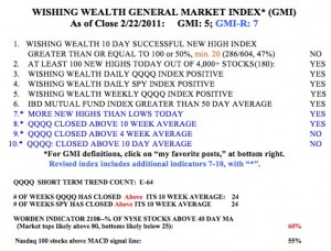 Because many new readers may be coming from the UMD Stock Challenge, I have created the UMDSMC category for all posts that have additional educational content. You can get a description of the GMI components by going to the Favorites section to the right of this page. Most people who have made a lot of money in the stock market talk about the importance of the general market’s trend to their success. The idea is that most stocks follow the trend of the general market. So, if one can figure out the trend, one can be sure to buy or sell consistent with it. My GMI indicator counts a number of short and long term indicators of the trend of the market. I focus largely on growth technology stocks, as reflected in the Nasdaq 100 Index. This index can be bought or sold by using a number of ETF’s (exchange traded funds). So, I follow the QQQQ (Nasdaq 100) and SPY (S&P500) and DIA (Dow 30 Industrials) ETF’s. You can look at this post to see how the GMI kept me out of the market during the big decline in 2008. I teach my students that it is possible to time the market and they should not ride a significant down-trend. Better to get out of a significant decline and to buy back in after it ends. (One can keep dollar cost averaging into diversified mutual funds all through the decline, though, because they tend to come back with the market.)