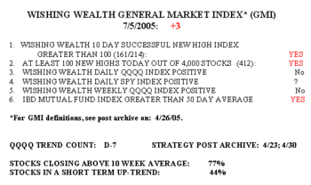 I am becoming accustomed to writing this blog–my first post was on 4/17. I try to post by midnight during trading days. During the weekend I have more time to reflect on the market and to write. I read all of your emails and greatly appreciate them, but I often must wait until the weekend to reply. (If I ever fail to respond, please remind me.) Writing this blog has actually helped my trading performance. It has helped me to systematize my rules and to have the discipline to follow them–thank you. My largest losses have occurred when I have deviated from my rules. Keep sending me your questions and comments. Send your feedback to silentknight@wishingwealthblog.com.